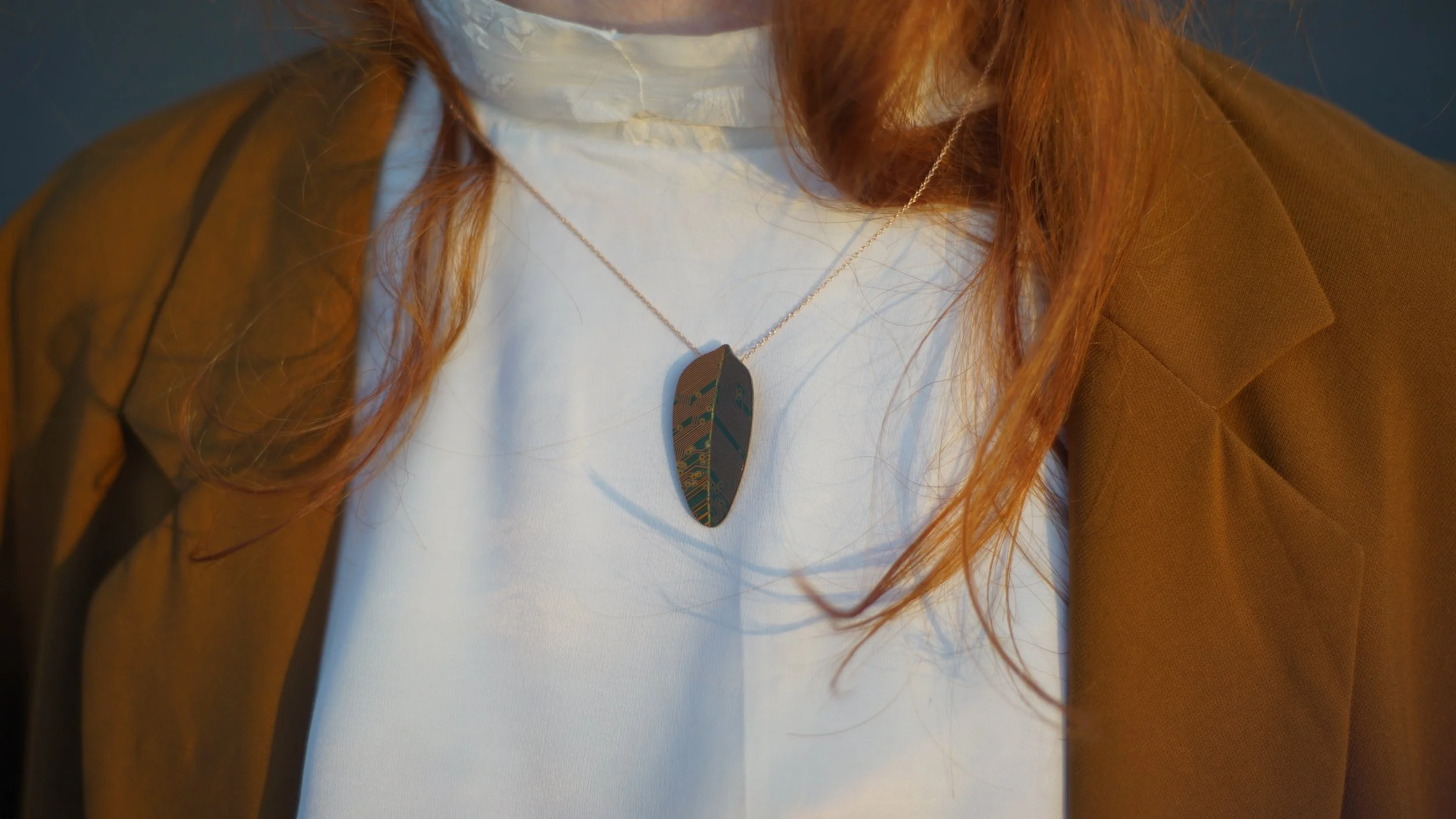 I’ll talk a little bit about a necklace in the form of a leaf. The idea came to me a few years back after a discussion I had with my best friend, Radu. He studies biology and told me about how locust trees are a bit parasitic in the ecosystem and are not even originally from our country even though we have traditional songs about them. For some reason that discussion stuck with me and I’ve associated this type of tree with the way that we, as humans, have a parasitic relationship with our resources. We take more and more and don’t give back. This is what this piece means to me: an organic form that is at the same time made from the result of a destructive society which reflects our way of being.